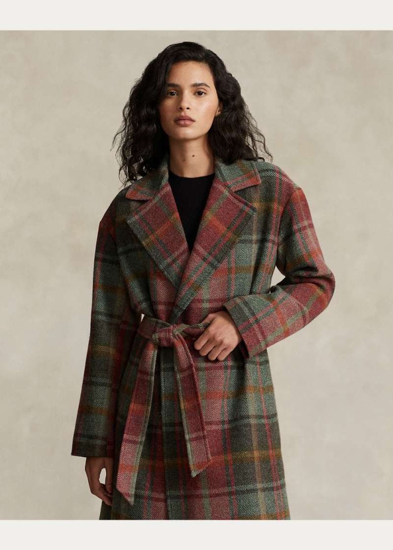 Elegant Ralph Lauren plaid wrap coat for women in brown. Made from soft lana-blend twill fabric. Available in sizes S to XXL.